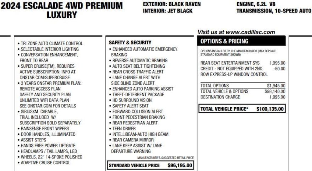 Leather Seats, Third Row Seat, Sunroof, Panoramic Roof, 4x4, Quad Bucket Seats, Power Liftgate, Rear Air, Heated Driver Seat, Heated Rear Seat, Cooled Driver Seat, Back-Up Camera, Running Boards, Premium Sound System, Onboard Communications System Keyless Entry, Privacy Glass, Remote Trunk Release, Steering Wheel Controls, Child Safety Locks. Cadillac 4WD Premium Luxury with BLACK RAVEN exterior and JET BLACK interior features a 8 Cylinder Engine with 420 HP at 5600 RPM*. CARFAX 1-Owner 172-Point Vehicle Inspection, including road test performed by trained Cadillac technicians, 1 year-unlimited mile Limited Warranty upon expiration of the New Vehicle Limited Warranty, $0 Deductible, All scheduled maintenance performed and up to date, Can be serviced at any Cadillac dealer nationwide, Digitally equipped vehicles are eligible for 3 trial months of OnStar Directions and Connections, 24-Hour Roadside Assistance with Courtesy Transportation, Satellite radio-equipped vehicles include a 3-month trial to SiriusXM All Access package Was $81,998.